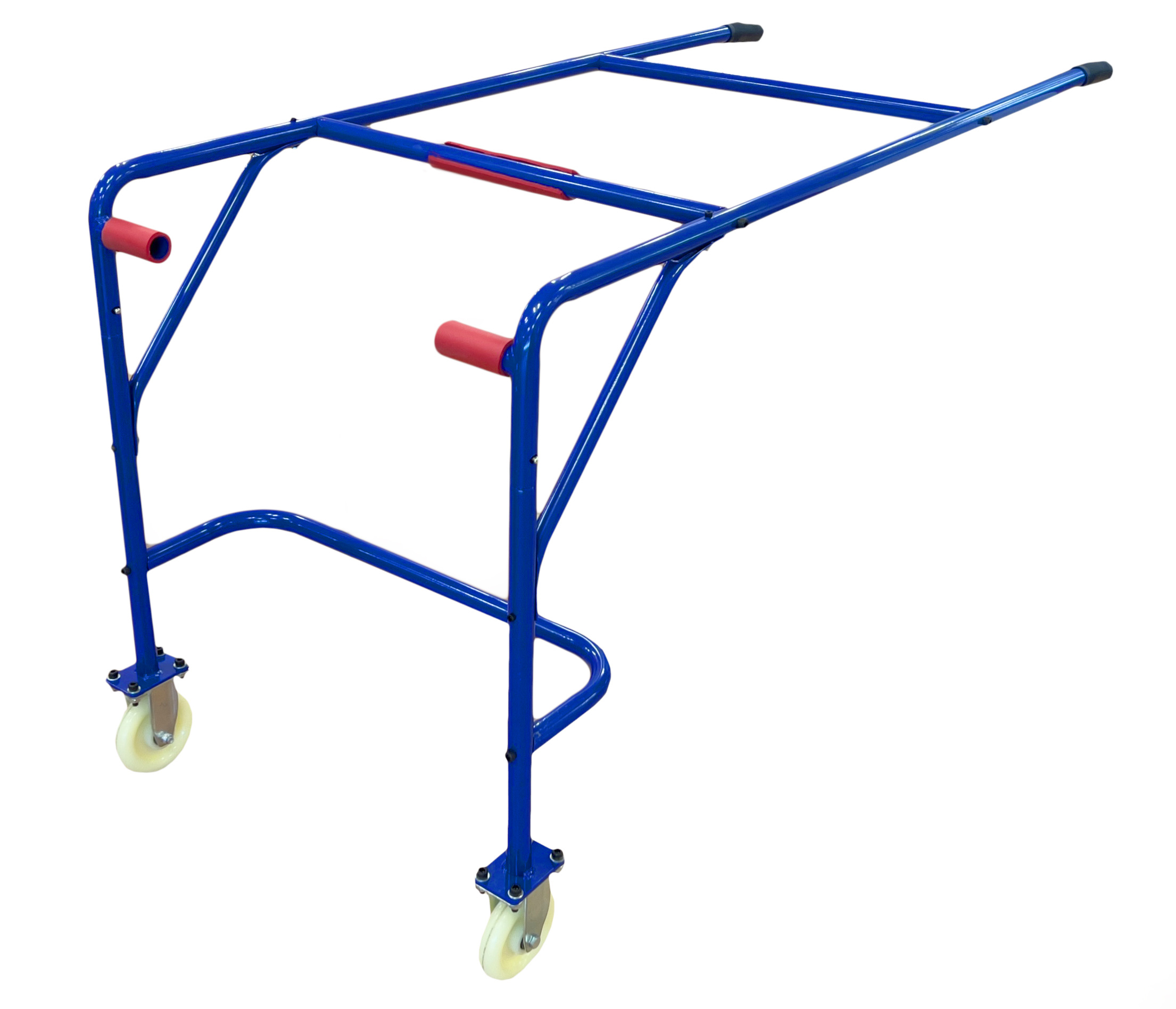Blue manual trolley for sewing machine transport.